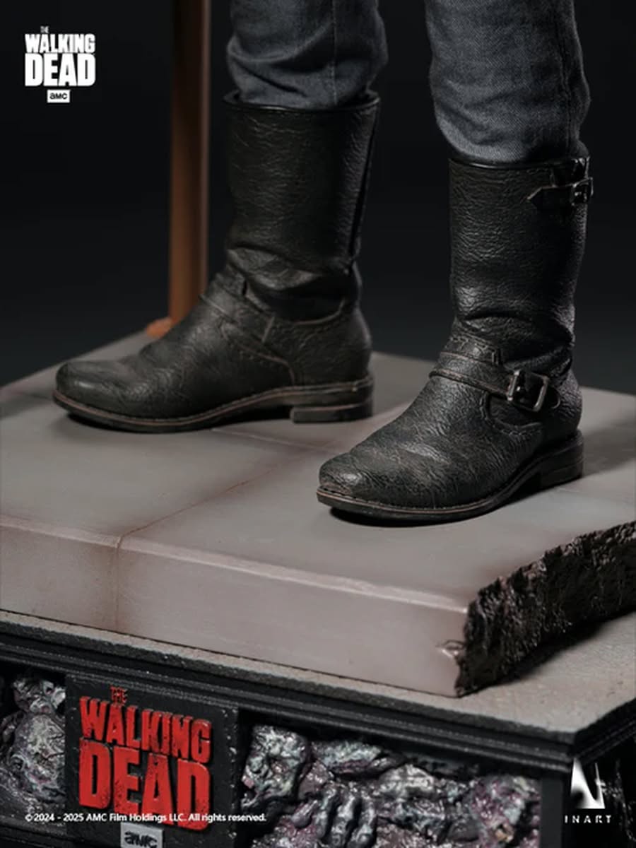 The figure features eye-movement technology for lifelike expressions and faithfully captures the character’s tall, lean physique. His iconic leather jacket includes a special metal zipper, perfectly scaled and detailed to replicate the texture and pattern seen on screen. Complete with his signature bat, Lucille, this figure is an incredibly realistic and accurate collectible—a must-have for any fan and collector looking to bring home the universe of The Walking Dead.